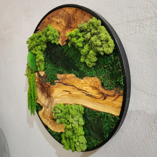 Botanisk stillhet - håndlaget veggkunst av mose med oliventre