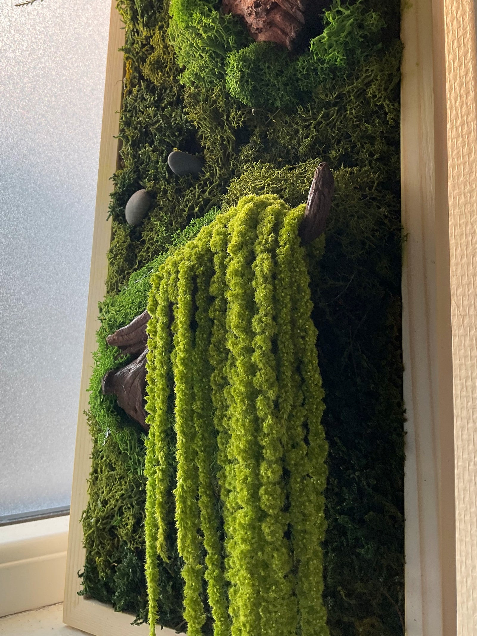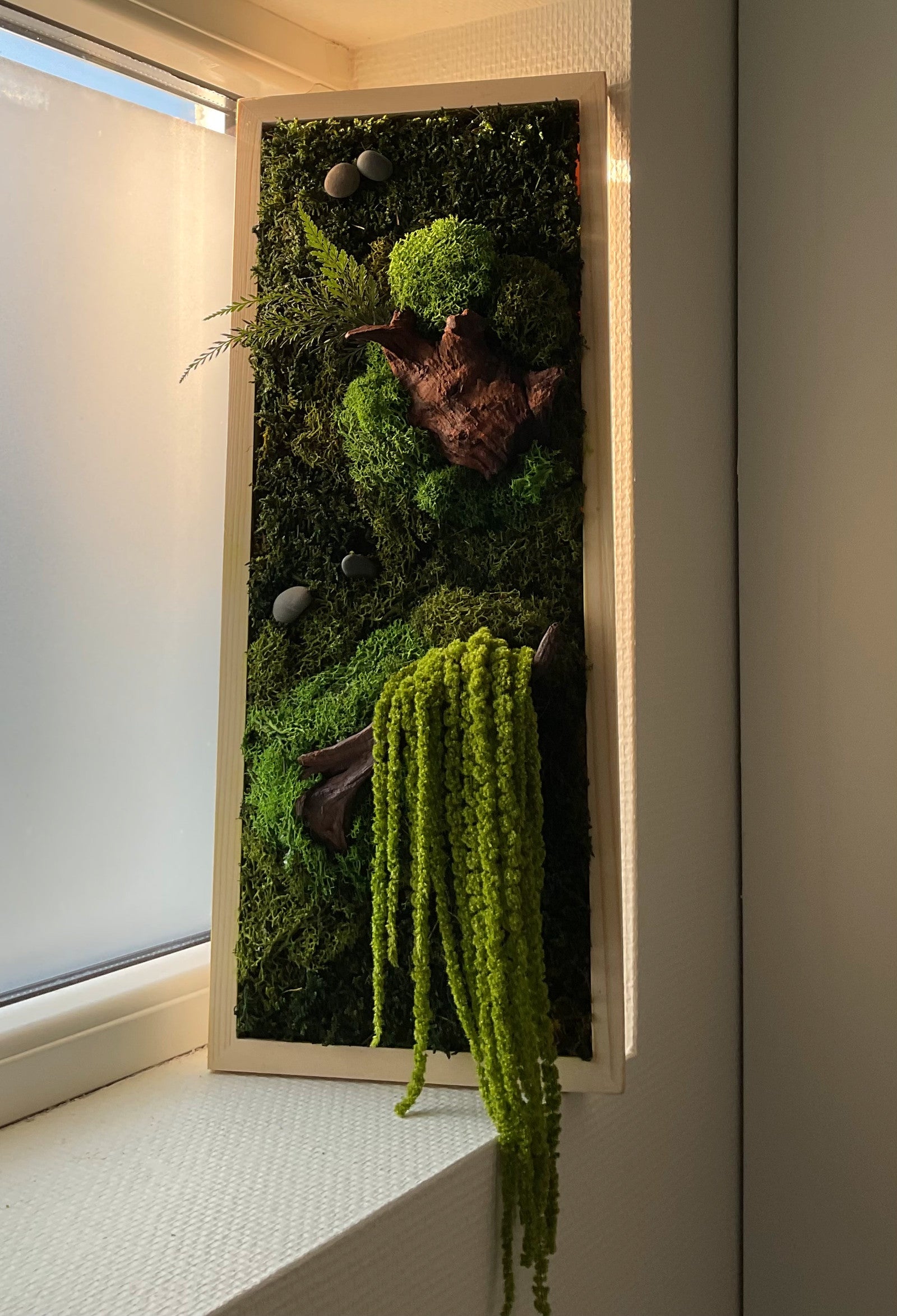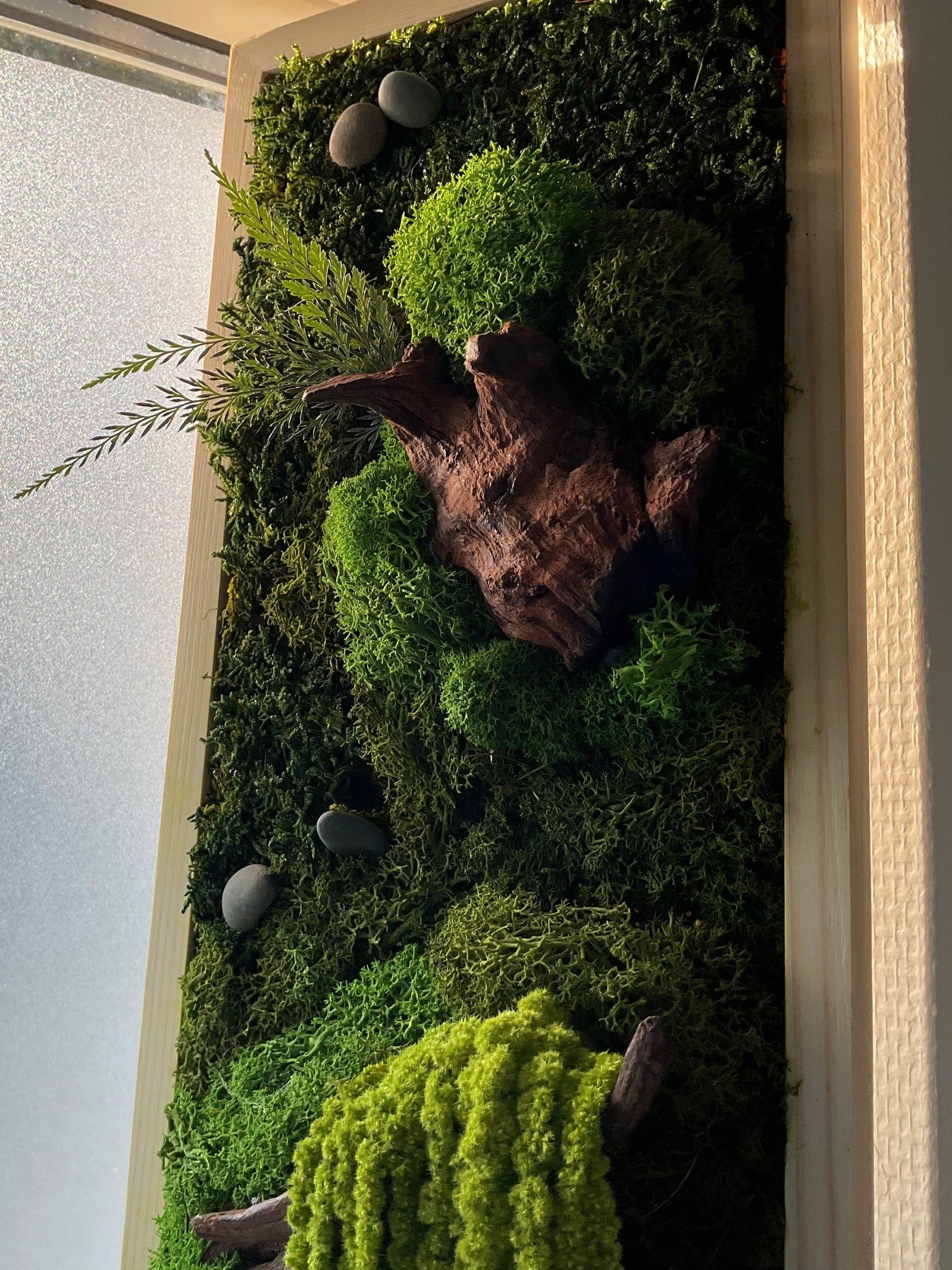 Bildet som vises er et modellbilde . Siden hvert mosebilde er laget for hånd med naturlige materialer, kan det være små variasjoner i farge, form og struktur. Dette er en del av det unike uttrykket og kvaliteten til håndlaget kunst.