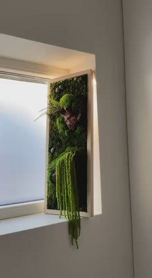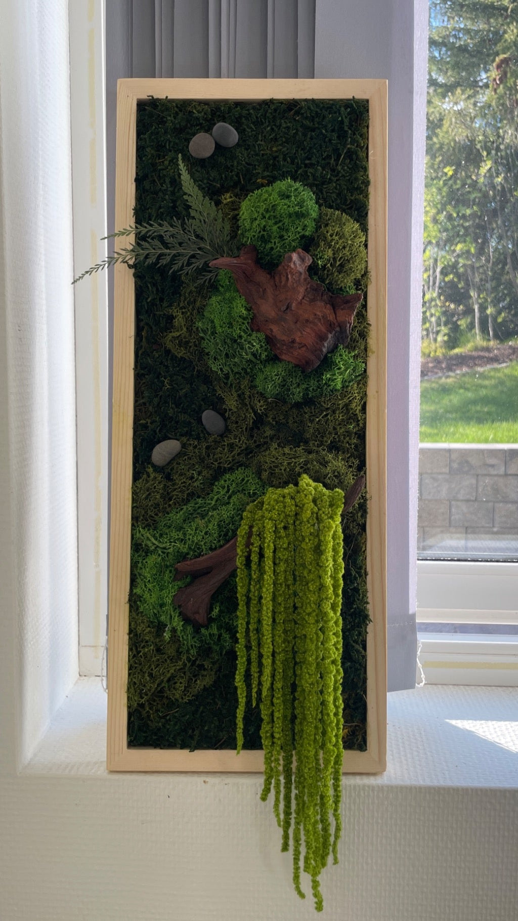 Mosekunst fra Evermoss er 100 % naturlig og krever minimalt vedlikehold. Mosen er stabilisert – det betyr at den er behandlet for å holde seg myk og grønn uten behov for vann eller sollys.