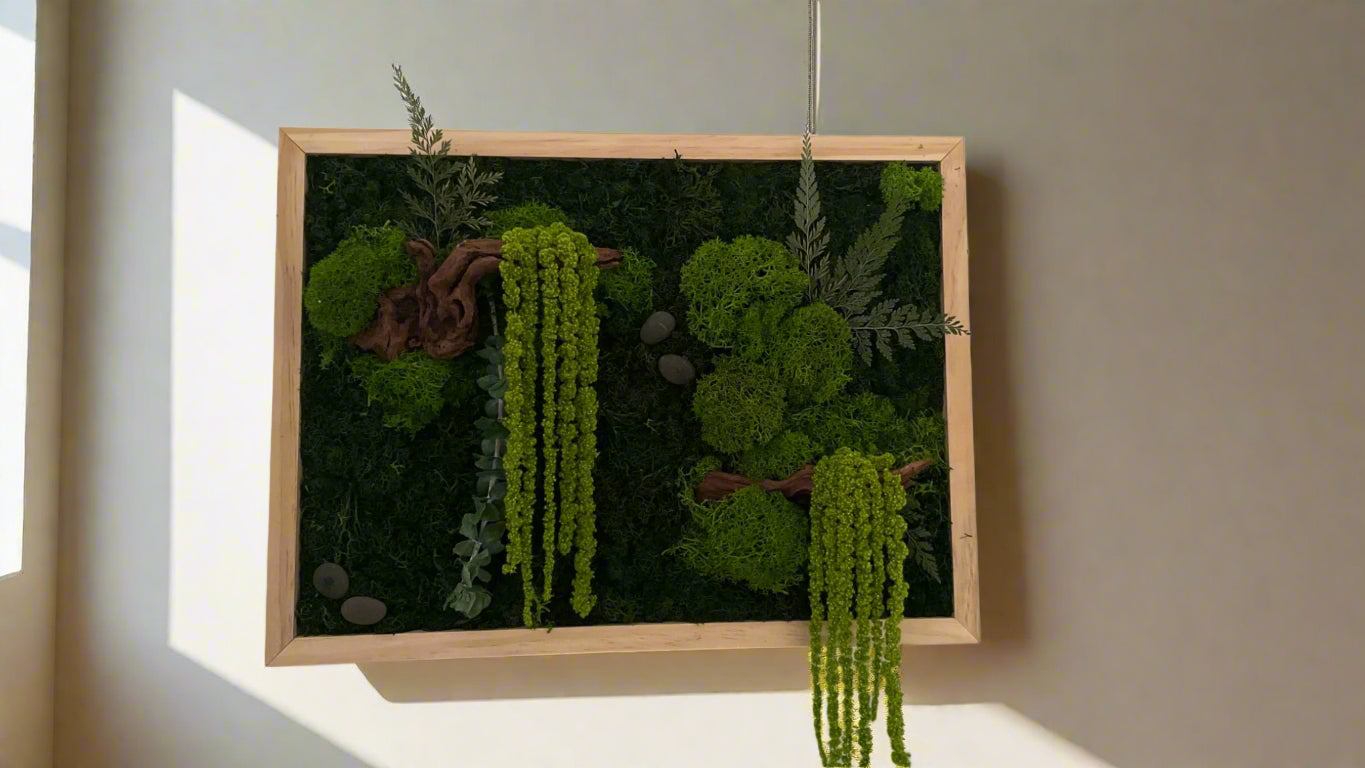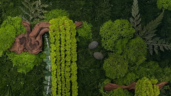 Mosekunst fra Evermoss er 100 % naturlig og krever minimalt vedlikehold. Mosen er stabilisert – det betyr at den er behandlet for å holde seg myk og grønn uten behov for vann eller sollys.