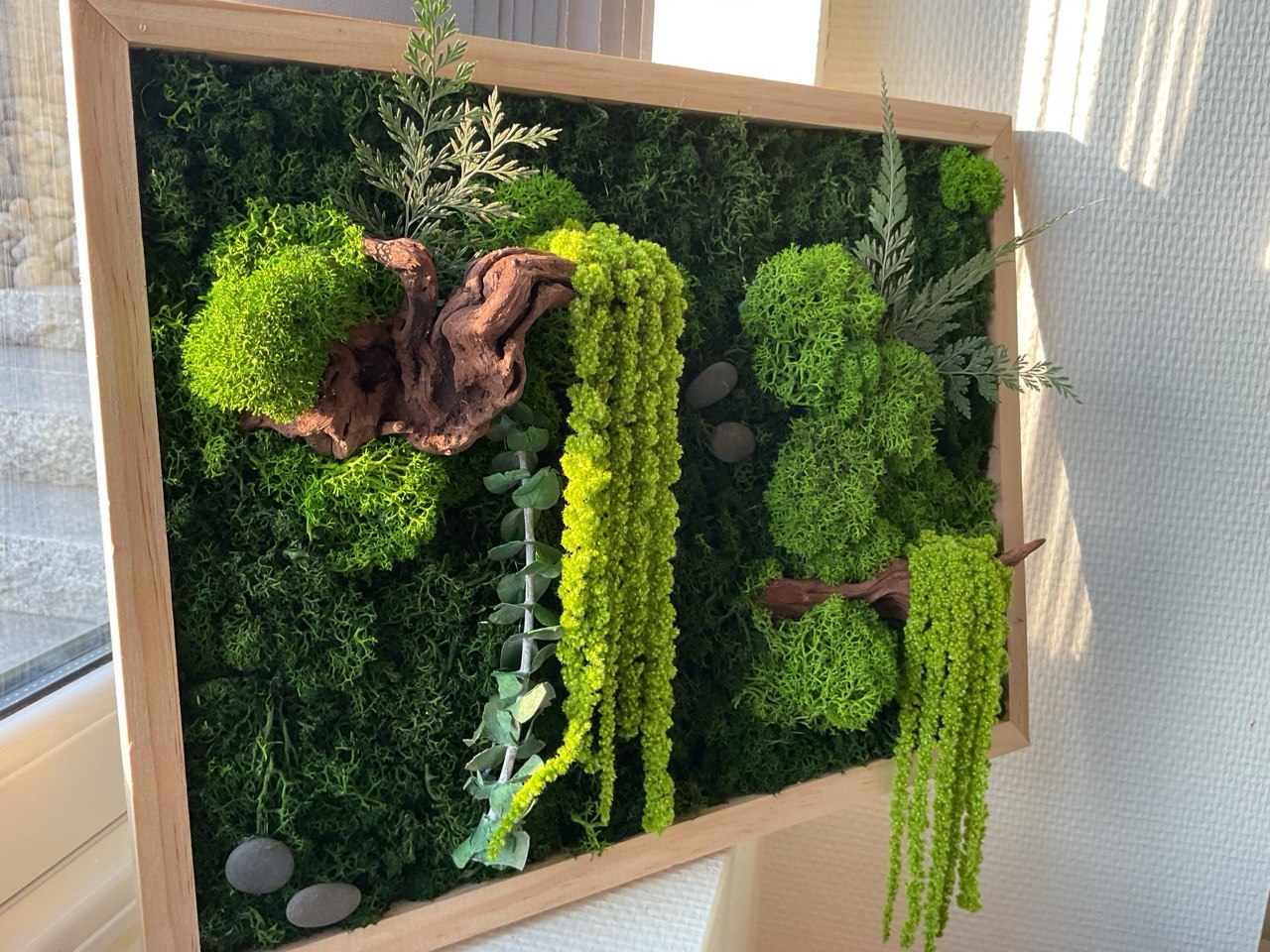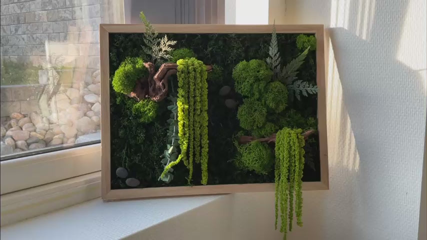 Ta med deg roen fra naturen inn i hjemmet ditt med Skogsro , et håndlaget mosebilde som gjenspeiler stillheten og skjønnheten i en grønn skog. Kunstverket består av ekte, preservert mose, hengende amaranthus, drivved og dekorative blader, satt sammen for å skape et levende og harmonisk uttrykk – helt vedlikeholdsfritt.