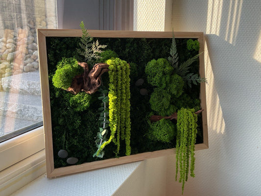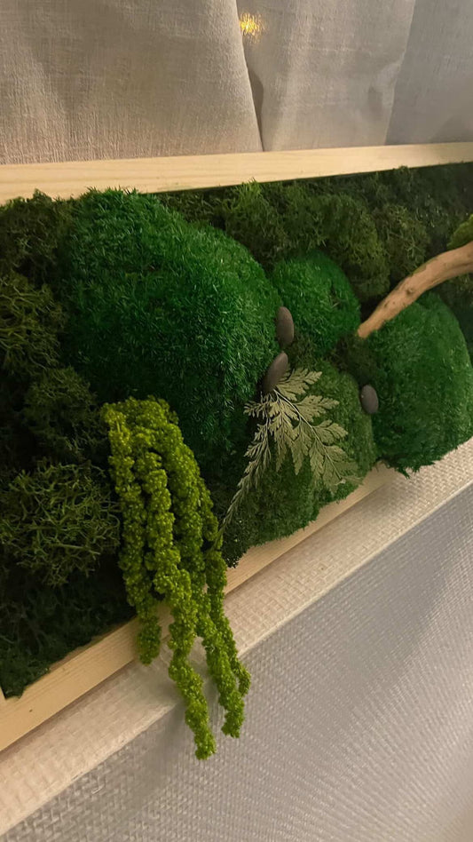 Mosekunst av konserverte naturmaterialer er så godt som vedlikeholdsfri. Siden mosen ikke lenger er levende, trenger den verken vann, sollys eller annet stell. Den holder seg myk og fin i et normalt innemiljø – bare direkte sollys og svært tørr luft for å bevare fargen og smidigheten. Blir kunstverket støvete med tiden, kan du enkelt friske det opp med en myk støvkost. Ellers kan du bare nyte det grønne innslaget uten bekymringer.